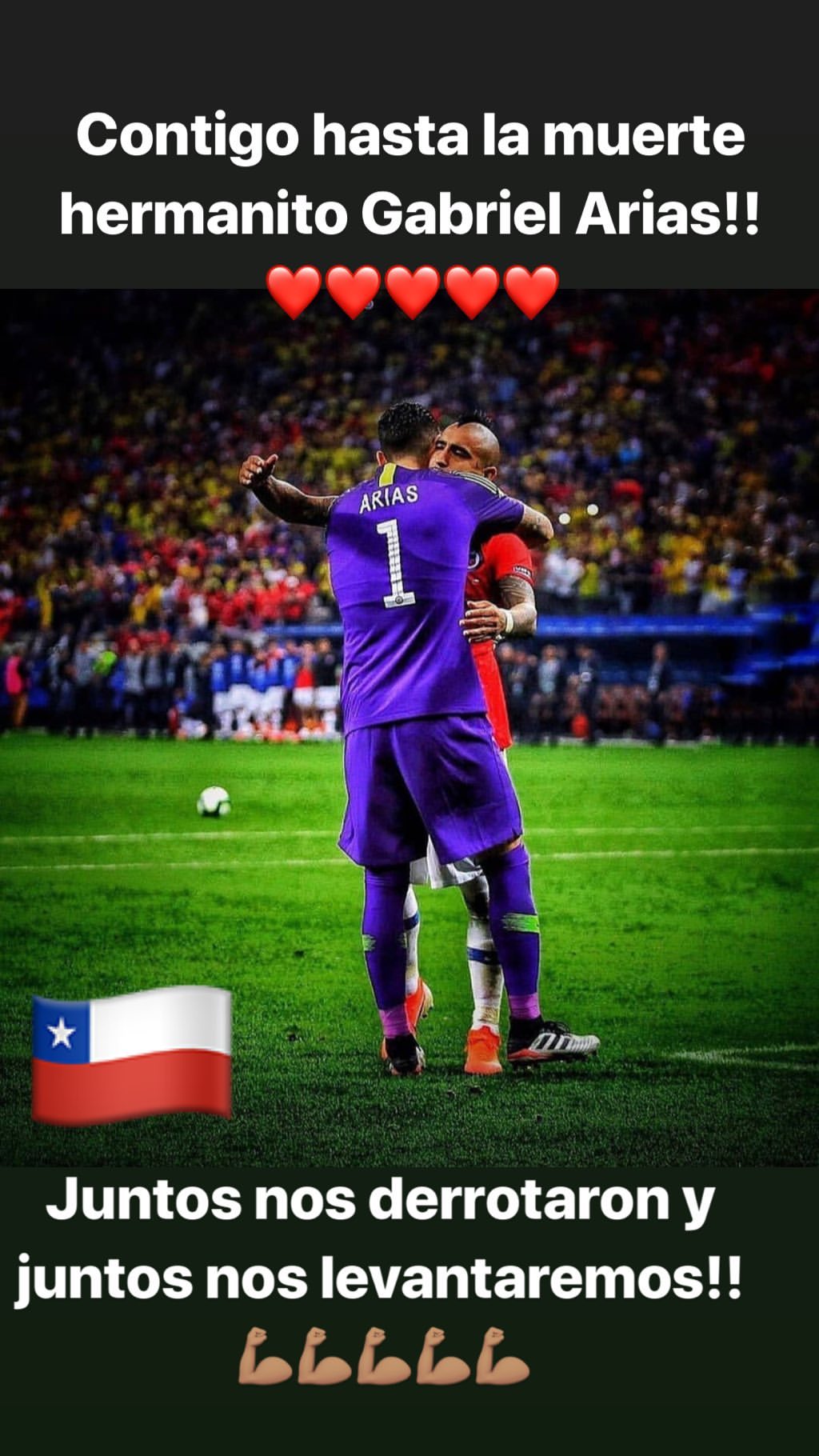 Orgulloso de esta familia que pelea siempre hasta el final por nuestros sueños. Agradecido por el apoyo de los millones de chilenos que nos empujan a creer siempre que podemos más. Ilusionado por lo que viene, vamos a seguir luchando todos juntos, más unidos que nunca!!!🇨🇱🇨🇱 pic.twitter.com/EPd1CGKjVx— Arturo Vidal (@kingarturo23) July 4, 2019