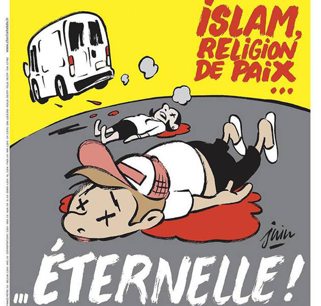 Mientras que otro episodio recordado fue el de la tragedia de La Rambla de Barcelona, donde fallecieron 15 personas. En esa oportunidad hicieron un dibujo en el que se ven dos cuerpos sobre charcos de sangre y la furgoneta blanca causante de la tragedia al fondo. Y se puede leer "Islam, religión de paz... eterna".