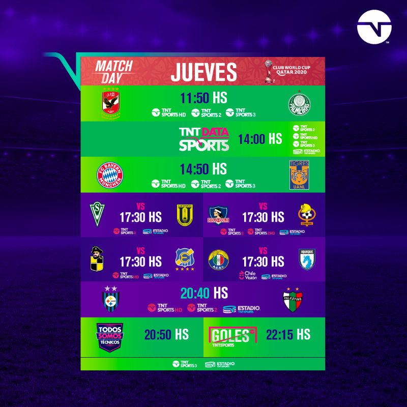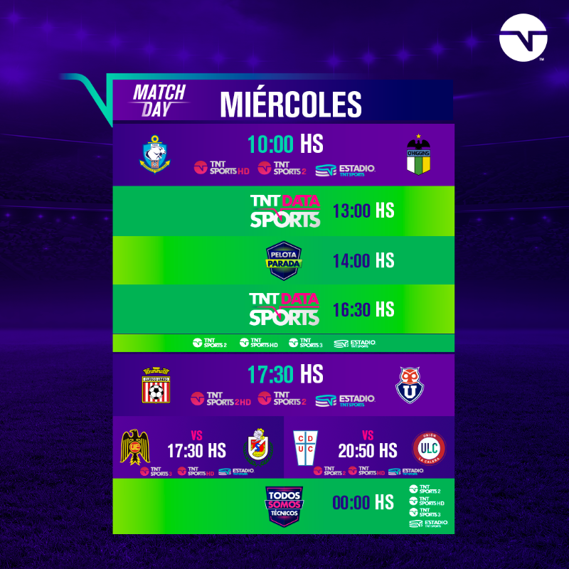 20:50 Universidad Católica vs. Unión La Calera (TNT Sports HD, TNT Sports 2 y Estadio TNT Sports)