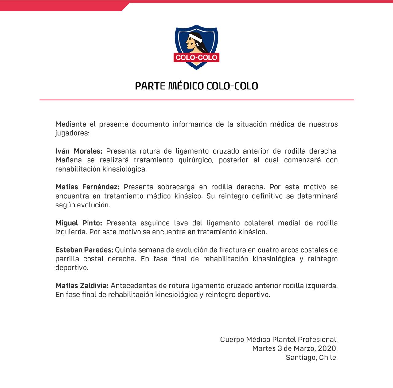 En tanto, Esteban Paredes (fractura en cuatro arcos costales de la parilla costal derecha) y Matías Zaldivia (rotura de ligamento cruzado anterior de la rodilla izquierda) están en la "fase final de rehabilitación kinesiológica y reintegro deportivo".