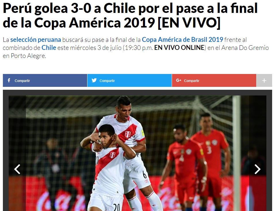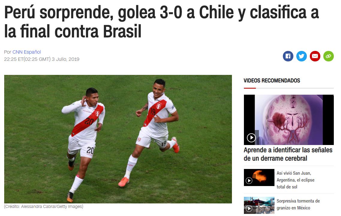 Lee también: Despertamos del sueño del tri: Chile es goleado por Perú y se debe conformar con pelear el tercer lugarSin duda uno de los puntos más destacados del triunfo del conjunto del Rimac pasó por Pedro Gallese, el guardameta que contuvo cada ocasión de gol nacional, incluso le atajó un penal lanzado por Eduardo Vargas al final del encuentro que pudo ser el descuento del honor.
