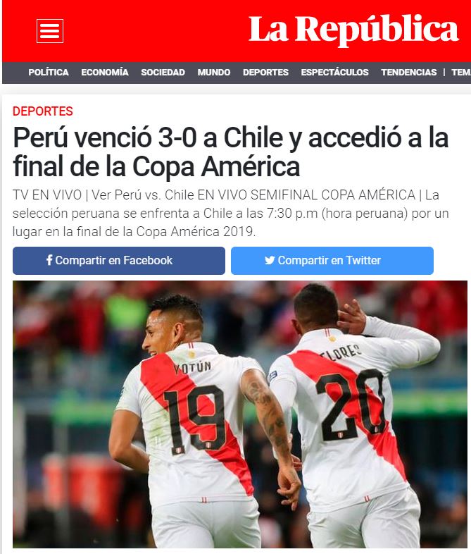 Los goles de Edison Flores, Yoshimar Yotún y Paolo Guerrero dejaron a los dirigidos por Reinaldo Rueda fuera de la final con Brasil que se disputará el domingo.