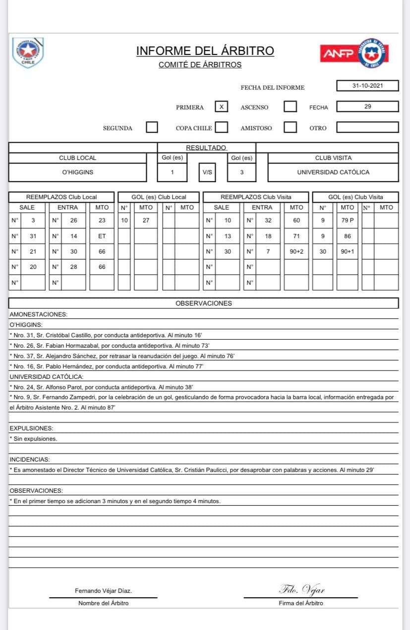 En el documento se da cuenta que Zampedri es amonestado “por la celebración de un gol, gesticulando de forma provocadora hacia la barra local, información entregada por el asistente el asistente número 2”.