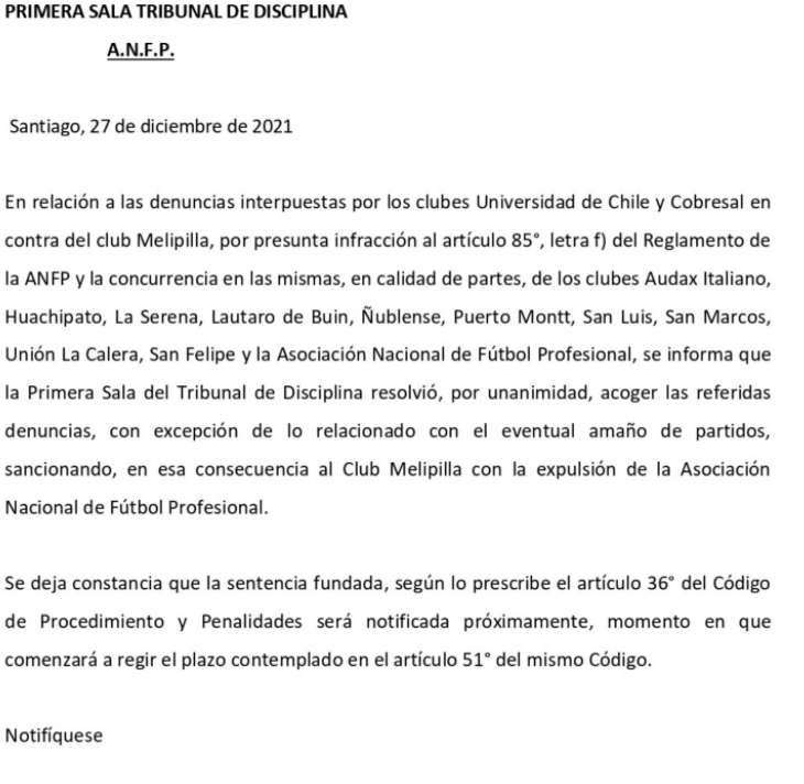 El Tribunal de Disciplina de la Asociación Nacional de Fútbol Profesional (ANFP) dio a conocer la resolución del caso Melipilla, luego de que diversos clubes presentaran una denuncia por dobles contratos de jugadores profesionales.