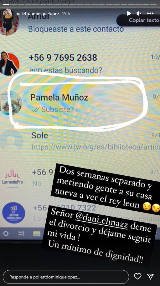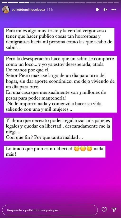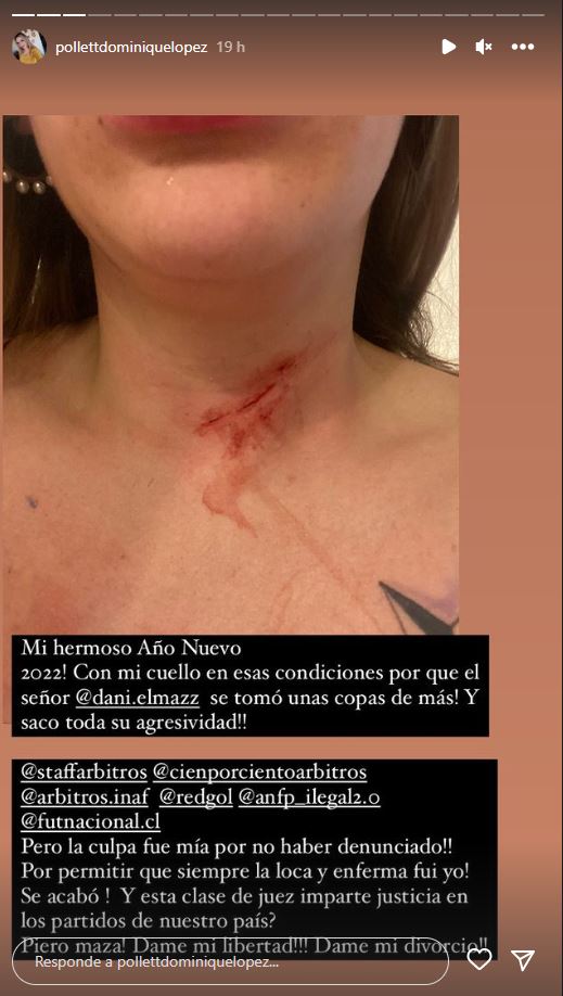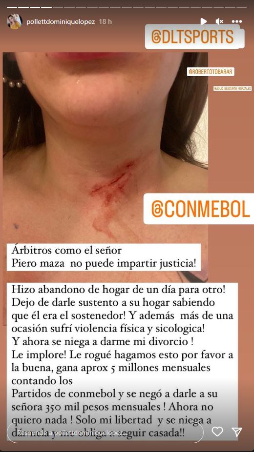 Pollet Dominique López publicó en sus redes sociales diferentes fotografías y escritos revelando el tormento que estaría pasando por los reiterados episodios de violencia física y psicológica por parte del juez de fútbol, quien no querría darle el divorcio.