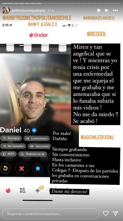 Sumado a todas las situaciones descritas, añadió que el juez del fútbol chileno cometió actos de infidelidad.