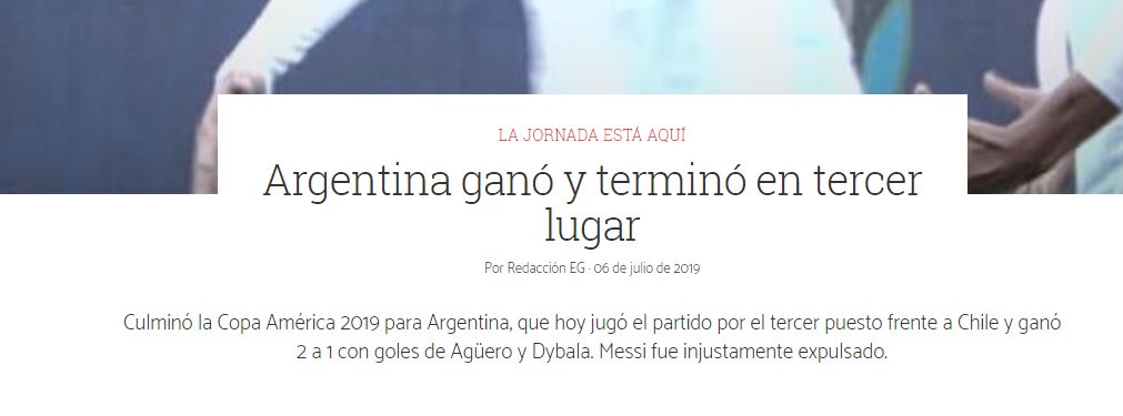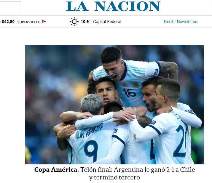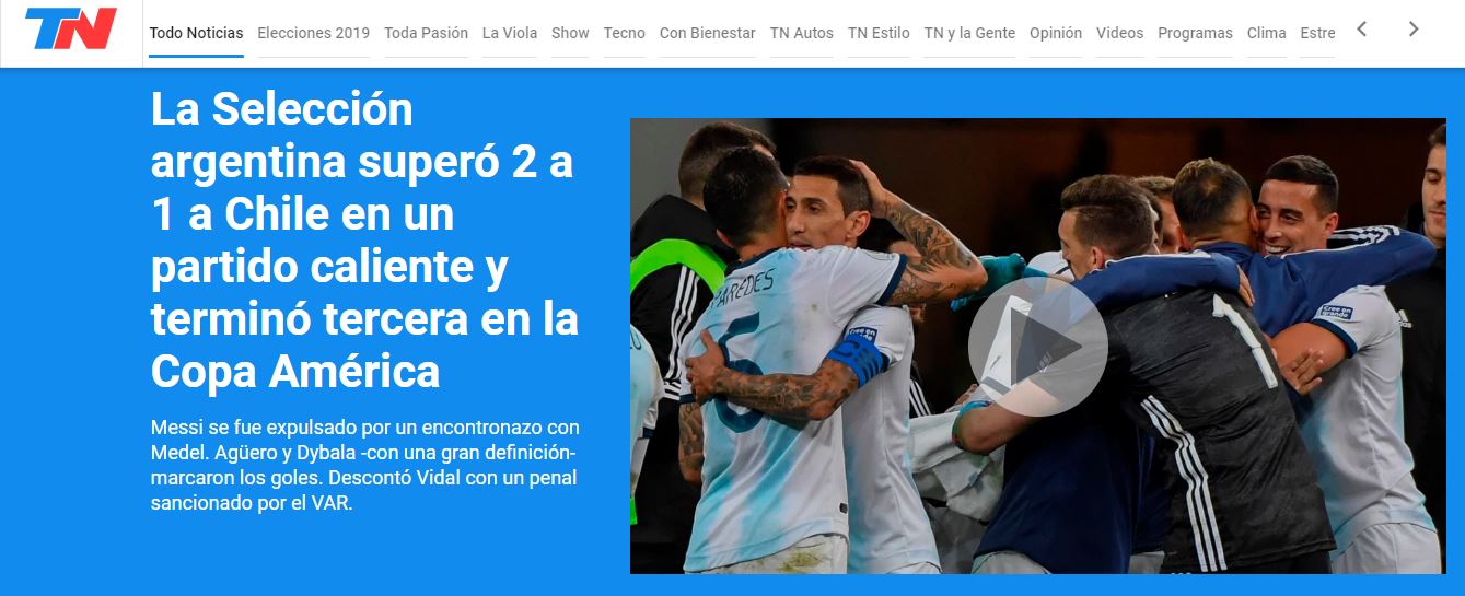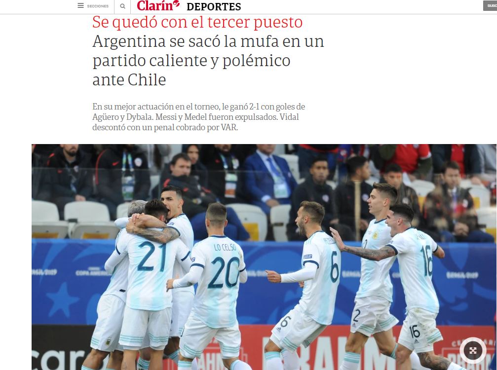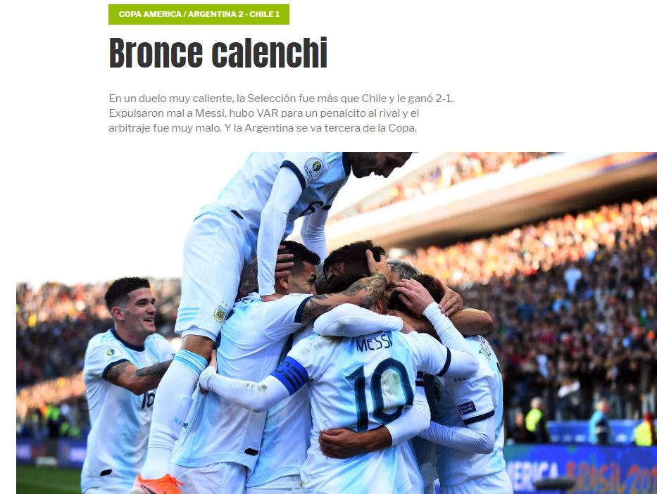 Olé tituló “Bronce calenchi”, señalando que “en un duelo muy caliente, la Selección fue más que Chile y le ganó 2-1. Expulsaron mal a Messi, hubo VAR para un penalcito al rival y el arbitraje fue muy malo. Y la Argentina se va tercera de la Copa”. Lee también: ¿Morbo? Así reaccionó la prensa internacional a la goleada que Perú le dio a ChileEl término “caliente” también fue usado por TN, mientras que Clarín apuntó que Argentina se “sacó la mufa”, en relación a las dos finales perdidas con Chile en 2015 y 2016.