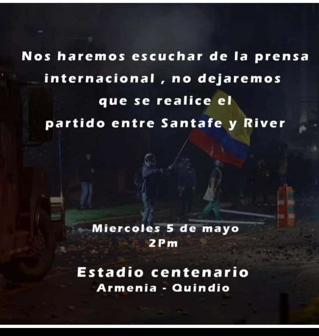 Lee también: El mensaje de J Balvin al presidente de Colombia: “Duque, paremos esta guerra civil”Es más, desde este lunes, a través de las redes sociales, se estaba convocando a una marcha en las afueras del estadio con el fin de suspender el duelo. “Nos haremos escuchar de la prensa internacional, no dejaremos que se realice el partido entre Santafe y River”, advertía la publicación.