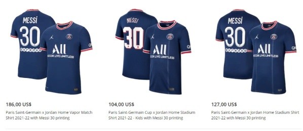 La tienda oficial que comercializa la indumentaria del PSG ya lanzó en su sitio web las primeras camisetas con el estampado de Messi y su número. La remera original del equipo en su versión de juego cuesta 186 dólares y en su versión “stadium” 127 dólares. En ambos casos con el dorsal y el apellido del rosarino; para hombre y para mujer.