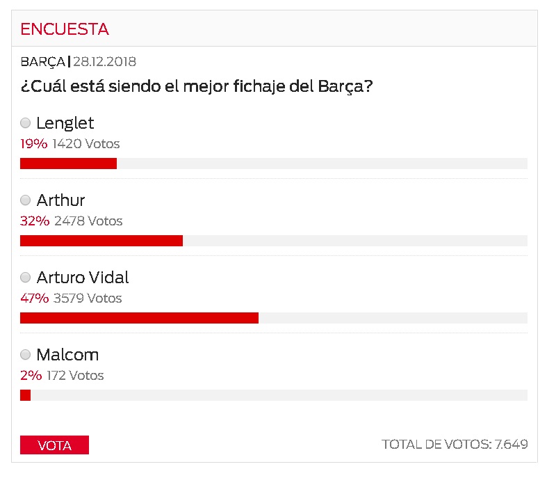 Tras ellos, estuvo Lenglet, quien solo alcanzó un 19% con 1.420 votos; cerrando Malcom con 172, es decir un 2% de las preferencias.