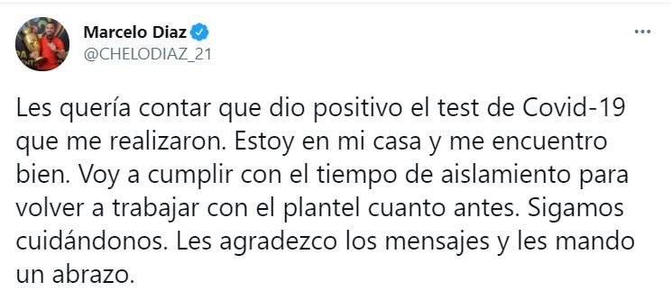 "Les quería contar que dio positivo el test de COVID-19 que me realizaron. Estoy en mi casa y me encuentro bien. Voy a cumplir con el tiempo de aislamiento para volver a trabajar con el plantel cuanto antes".