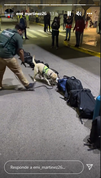 "Y bueno, como siempre… ¡Quilombo, quilombo!", dice Dibu en un video. En otro registro, en tanto, muestra a un perro de la PDI oler las pertenencias del equipo dirigido por Lionel Scaloni. "¡Encontró un Sugus, encontró un Sugus!", expresa en Instagram stories.