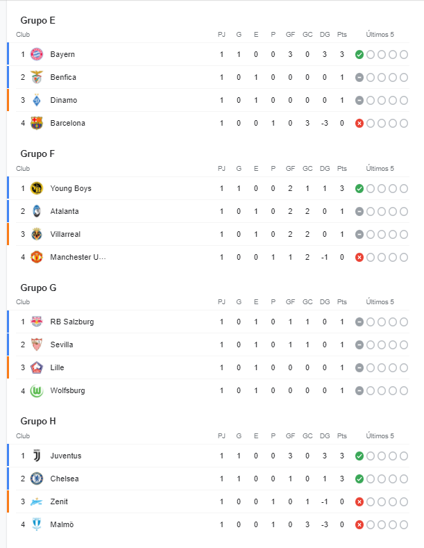 En la jornada de este miércoles 15 de septiembre se cerró la participación de los mejores clubes de Europa en la primera fecha de la fase de grupos de la Champions League, torneo más importante a nivel de equipos del viejo continente.