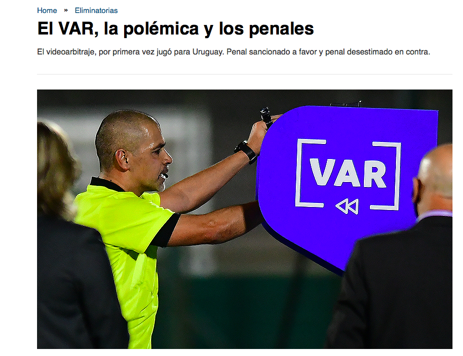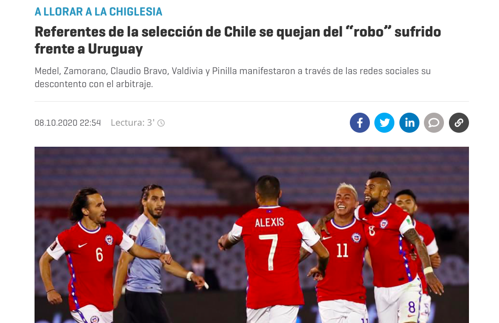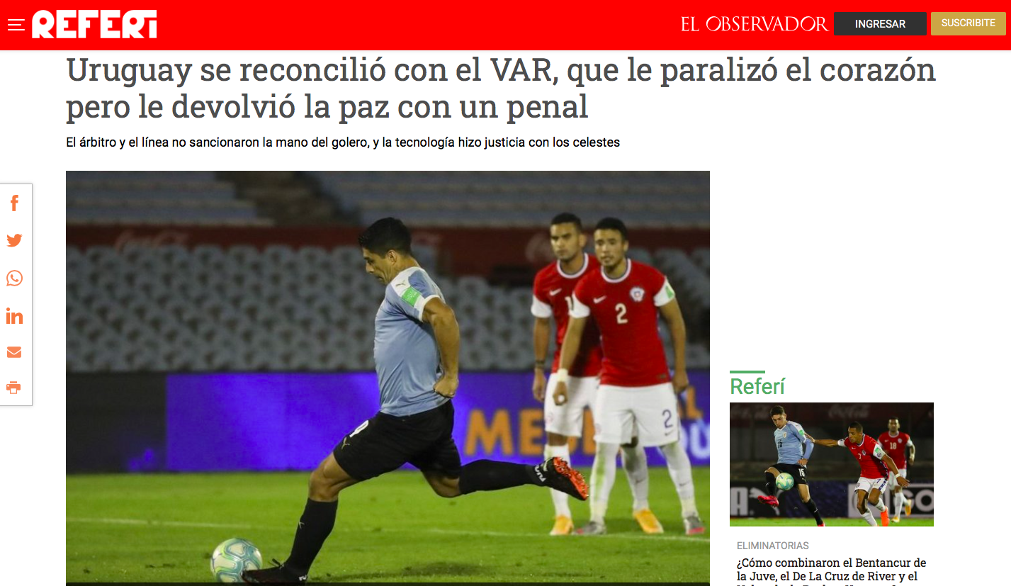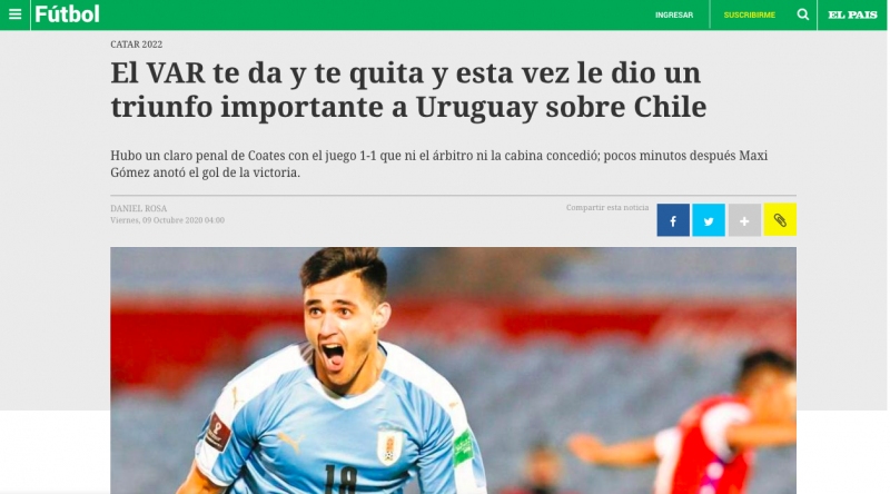 Por otro lado, El País de Uruguay tituló El VAR te da y te quita y esta vez le dio un triunfo importante a Uruguay sobre Chile y reconoció que "hubo un claro penal de Coates con el juego 1-1 que ni el árbitro ni la cabina concedió".