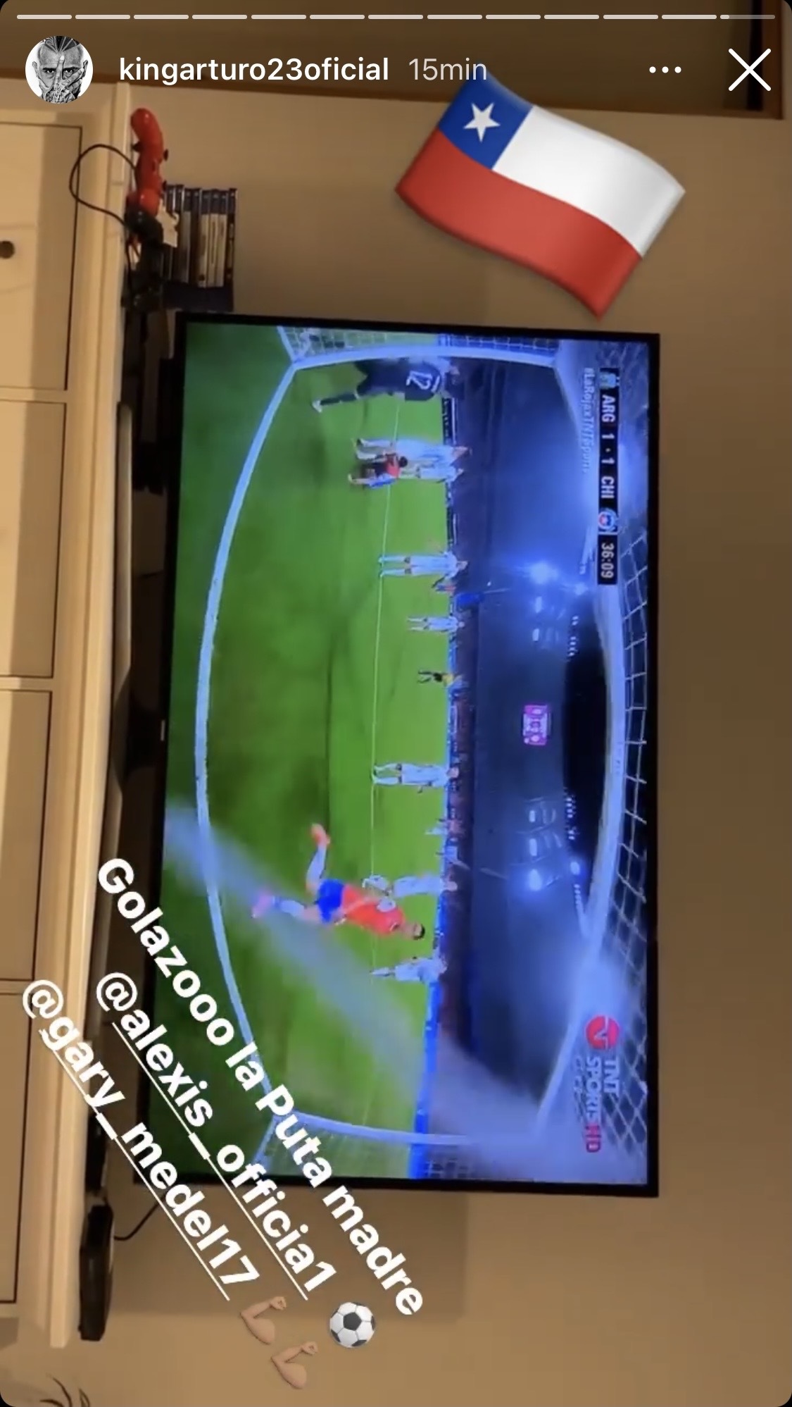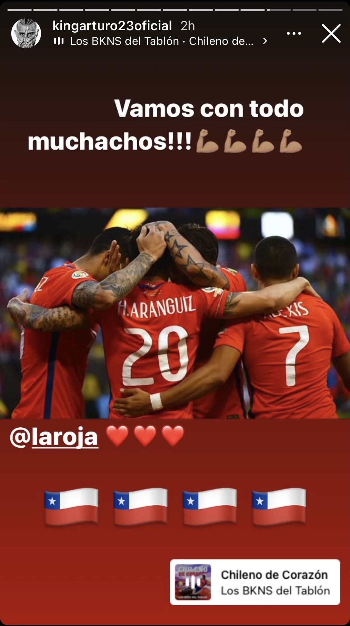 Mediante su cuenta de Instagram, el "rey Arturo" dedicó un mensaje de apoyo previo al duelo. Junto a una imagen donde aparece Charles Aránguiz y Alexis Sánchez, el volante escribió "vamos con todo muchachos", sonando de fondo la icónica canción Chileno de Corazón.