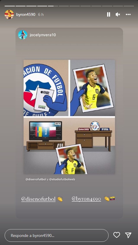 En ese mismo sentido, Castillo compartió un meme en el que fue etiquetado por la periodista de DirecTV Sports de Ecuador, Jocelyn Vera, en el cual se puede apreciar a la ANFP con una fotografía en mano del jugador viendo el debut de la Tricolor ante Qatar en la cita planetaria.