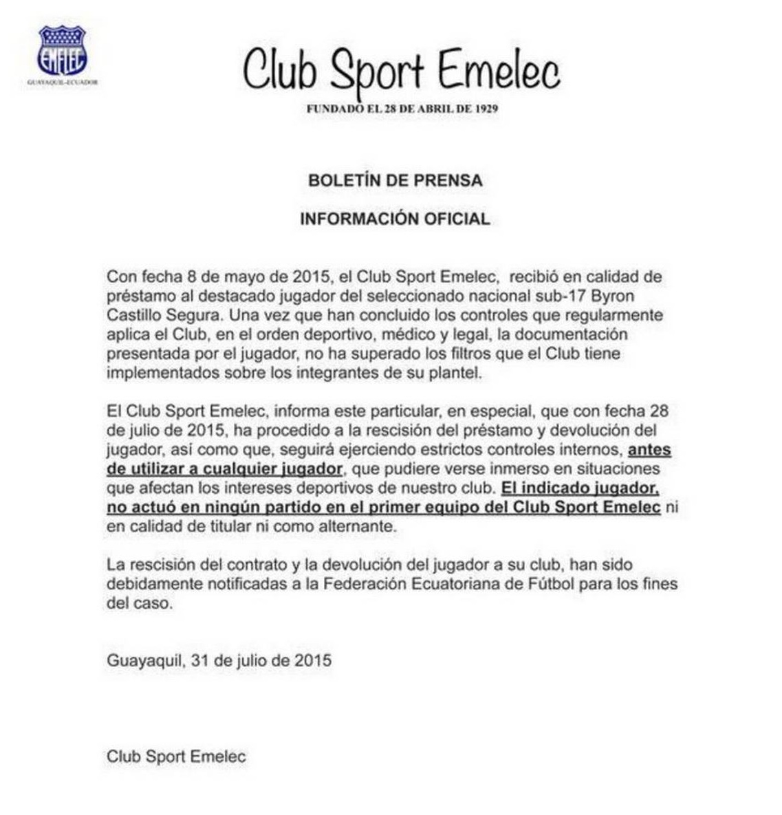 "Con fecha 8 de mayo de 2015, el Club Sport Emelec recibió en calidad de préstamo al destacado jugador del seleccionado nacional sub-17 Byron Castillo Segura. Una vez que han concluido los controles que regularmente aplica el club, en el orden deportivo, médico y legal, la documentación presentada por el jugador, no ha superado los filtros implementados sobre los integrantes de su plantel", dice el comunicado del equipo ecuatoriano.