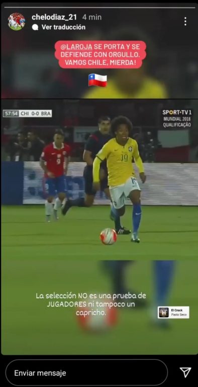 Lee también: Los memes y reacciones tras la salida de Robinson de la Roja: "No hay como mi Ben Brereton"El futbolista publicó en sus historias un video en el que aparece disputando un balón con Willian en el duelo entre Chile y Brasil en Santiago, por las clasificatorias a Rusia 2018, junto al texto: “La Roja se porta y se defiende con orgullo ¡Vamos Chile, mierda!”.
