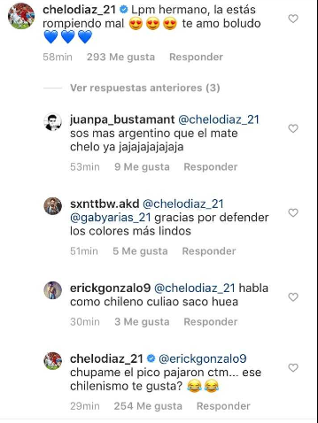 Entre los cientos de comentarios, uno le contestó: "habla como chileno culiao saco huea", a lo que el volante de Racing respondió: "chupame el pico pajaron ctm... ese chilenismo te gusta?", junto a un par de emojis riéndose.
