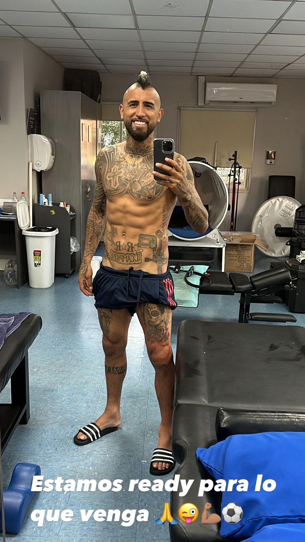 En la imagen se puede ver una selfie del futbolista en la que se muestra usando solo unos shorts deportivos. Lo curioso es que en su muslo izquierdo se puede ver el rostro de su ex esposa.@kingarturo23oficial