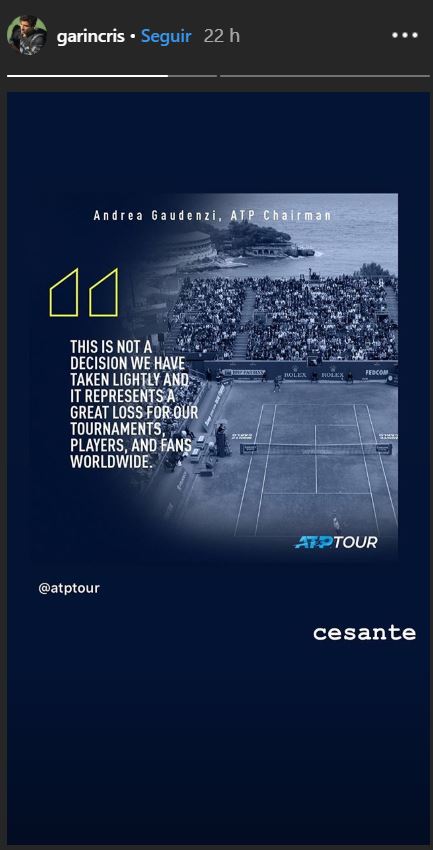 Lee también: Cristian Garin vence a Mager y se corona campeón del ATP 500 de Río de JaneiroCabe mencionar que, este jueves la ATP suspendió por seis semanas el torneo masculino de tenis.