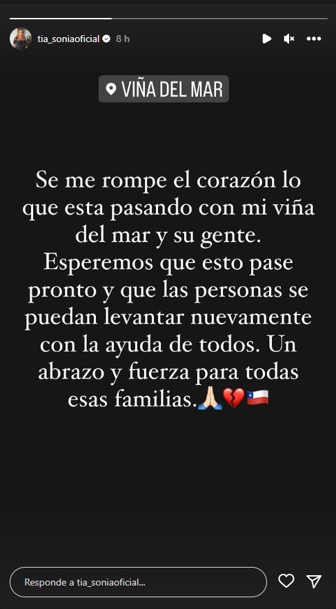 "Se me rompe el corazón lo que está pasando con mi Viña del Mar y su gente. Esperemos que esto pase pronto y que las personas se puedan levantar nuevamente con la ayuda de todos. Un abrazo y fuerza para todas esas familias", señaló.
