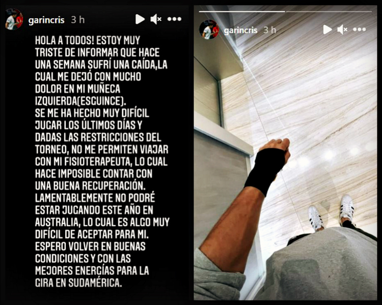 A través de su Instagram, la primera raqueta nacional informó que "estoy muy triste de informar que hace una semana sufrí una caída, la cual me dejó con mucho dolor en mi muñeca izquierda (esguince)”.