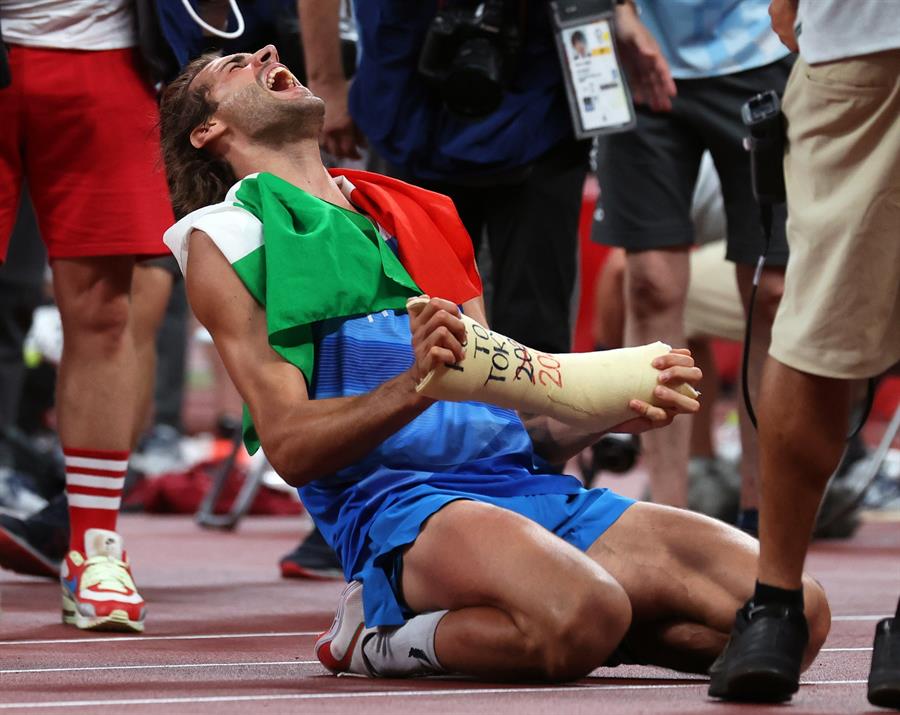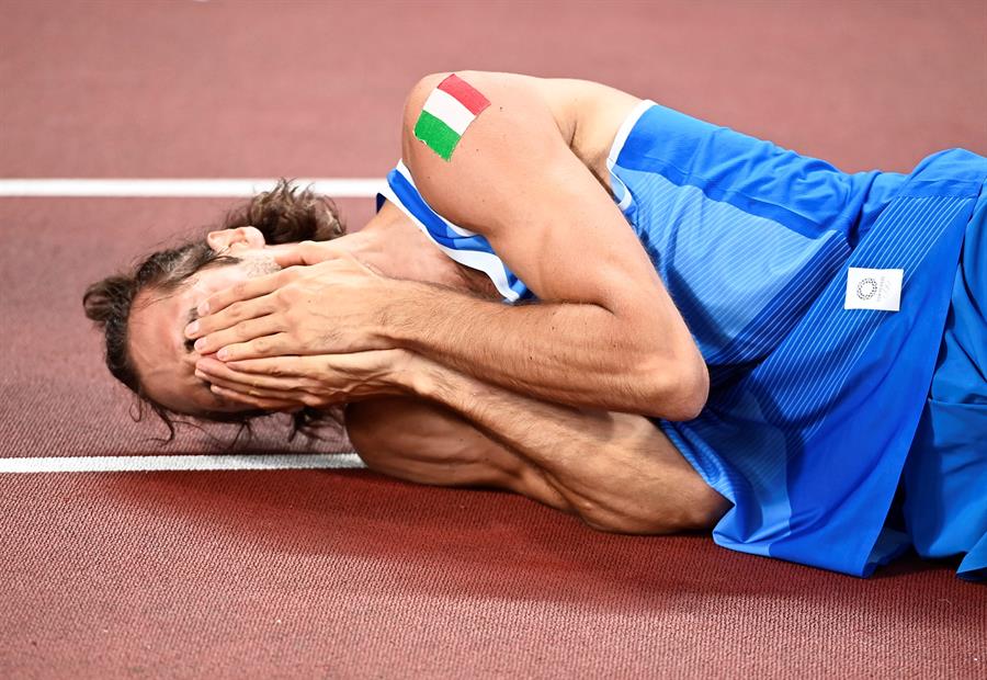 Si bien ambos evidentemente quedaron contentos con la decisión, fue la expresividad de Tamberi la más llamativa, ya que se lanzó al suelo, lloró, se llevó las manos a la cara, gritó y se abalanzó a sus compañeros con la bandera de su país para luego hacer lo mismo con Barshim.