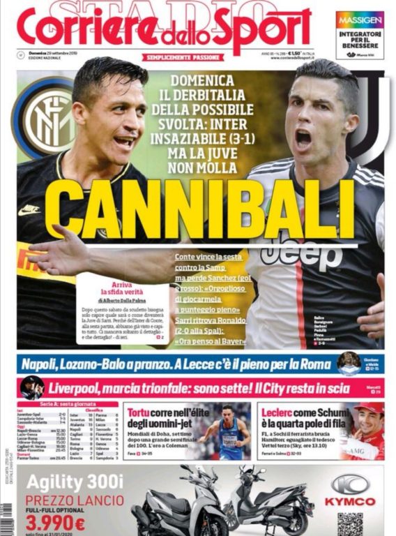 "Caníbales" titularon en el medio italiano de cara al partido entre el Inter y la Juventus. "Inter insaciable mas la Juve no se rinde".