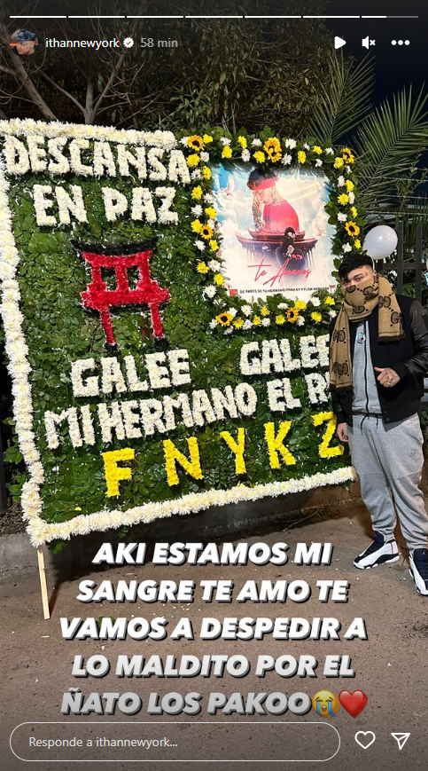 En los registros que compartió el intérprete de Flow NY se aprecia una arreglo de flores en homenaje a Gabriel. "Descansa en paz Galee Galee. Mi hermano, el rey", son las palabras que utilizaron. La información acerca de la despedida que le están dando al reconocido cantante de trap fue confirmada por Carabineros, desde donde comentaron que ejecutaron el protocolo "que se realiza cuando hay este tipo de velorios". De igual manera, detallaron que hasta el momento la instancia se está ejecutando "sin novedad". Por su parte, a través de las redes sociales de Yakuza Mafia, grupo que integraba el fallecido artista, informaron que "próximamente compartiremos detalles sobre la ubicación para despedir a nuestro amigo. En respeto a su familia, les brindaremos un espacio tranquilo para su despedía íntima, seguido de la oportunidad para que sus fanáticos le den su último adiós".