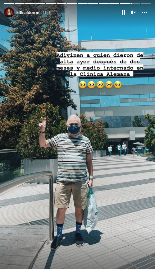 "Adivinen a quién dieron de alta ayer después de dos meses y medio internado en la Clínica Alemana", escribió Calderón la noche de este martes en una fotografía en la que aparece su padre frente a las dependencias del recinto.