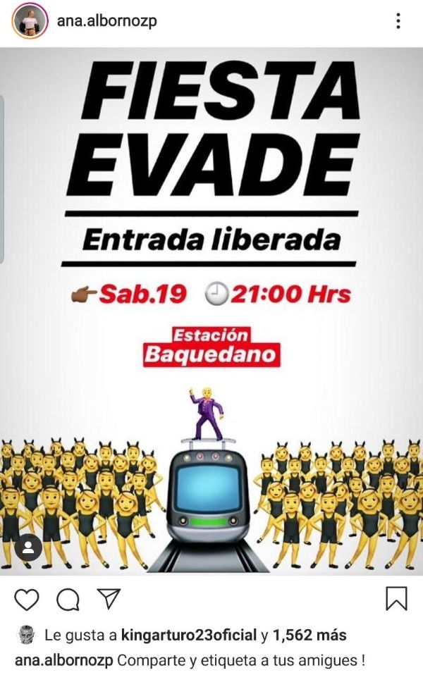La bailarina y coreógrafa Ana Albornoz publicó en su Instagram una imagen sobre la "Fiesta evade" a las 21:00 horas en estación Baquedano. Según dan cuenta usuarios de Twitter, el todocampista del Barcelona le dio like a esa publicación.