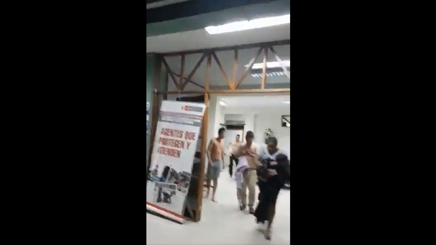 Lee también: "Es el sismo más fuerte de los últimos 12 años": Vizcarra se refirió al terremoto que afectó PerúAl dejarlos salir, los detenidos se acercan rápidamente hacia la puerta de salida del edificio y el efectivo ordena que "cada uno agarre un detenido", pero sus compañeros no alcanzan a hacerlo, por lo cual algunos de ellos abusan del pánico del momento se dan a la fuga.