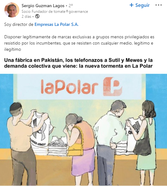 "Soy director de Empresas La Polar S.A. Disponer legítimamente de marcas exclusivas a grupos menos privilegiados es resistido por los incumbentes, que se resisten con cualquier medio, legítimo e ilegítimo", señaló en la mencionada red social.