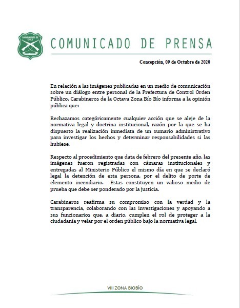 Ante la difusión de estas imágenes, Carabineros de la Octava Zona Bío Bío comunicó que rechazaba "categóricamente cualquier acción que se aleje de la normativa legal y doctrina institucional", por lo que se llevará a cabo un sumario administrativo para investigar lo ocurrido y determinar responsabilidades.