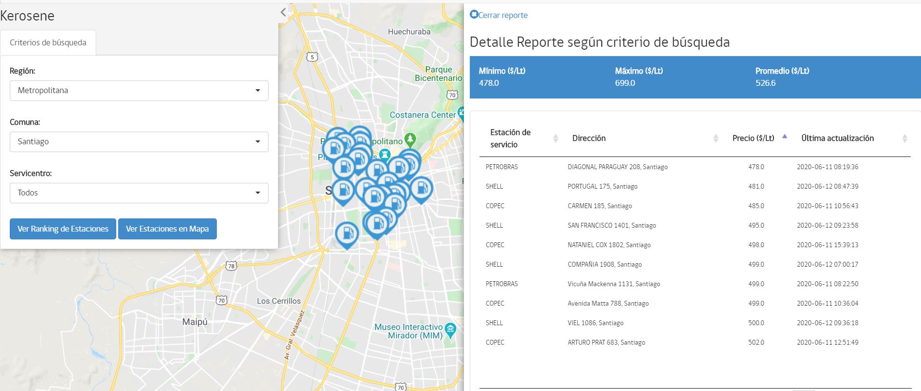 El sitio realiza la búsqueda utilizando filtros, por lo que permite una visualización georreferenciada que muestra el detalle por regiones y comunas, por ejemplo. Junto a esto, despliega las estaciones de servicio operativas.