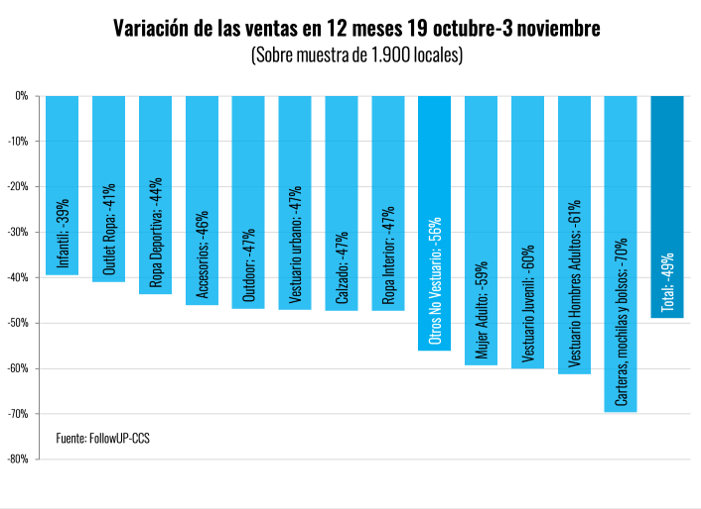 Lee también: Dueño de la Fuente Alemana: "Las ventas han caído un 80%"Las categorías más afectadas corresponden a bolsos y carteras, con una caída del 70% en sus ventas, y vestuario juvenil, hombre y mujer, todos con contracciones en torno al 60%.