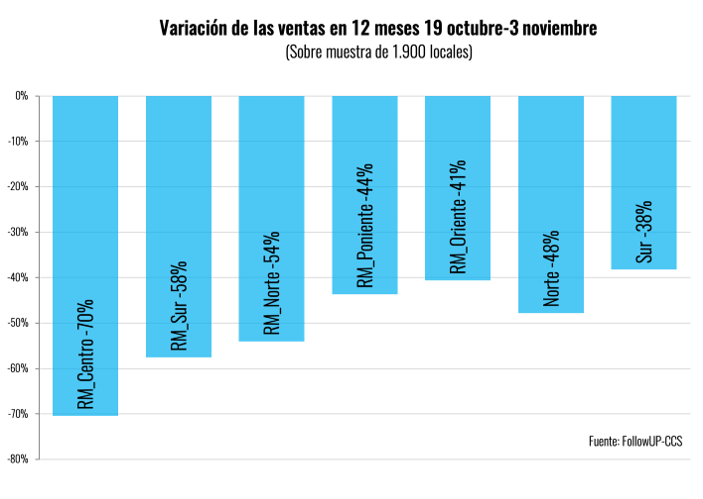 Las zonas geográficas más afectadas por la caída en ventas corresponden a Santiago Centro, con una caída en ventas del 70% en el período analizado, seguido de los sectores sur y norte de la capital (-58 y 54% respectivamente), todas áreas enormemente golpeadas por los hechos delictuales que afectaron han afectado al sector.