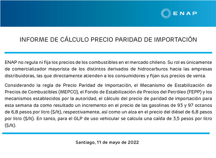 La Empresa Nacional del Petróleo (ENAP) anunció este miércoles una nueva alza en el precio de los combustibles.