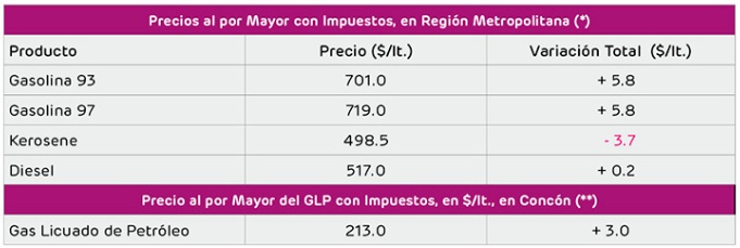 Te puede interesar: Por segunda semana consecutiva: Precios de las bencinas subirán este juevesEn el caso de la gasolina de 93 octanos subirá 5,8 pesos, al igual que la de 97. Mientras que el kerosene, tendrá una baja de 3,7 pesos.