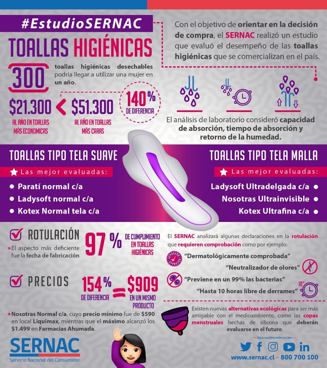 El análisis del Sernac se realizó debido a que este es uno de los productos más utilizados por mujeres, pudiendo gastar hasta $50 mil al mes en estas toallas, diferencia de $30 mil si comparamos con las toallas más baratas.