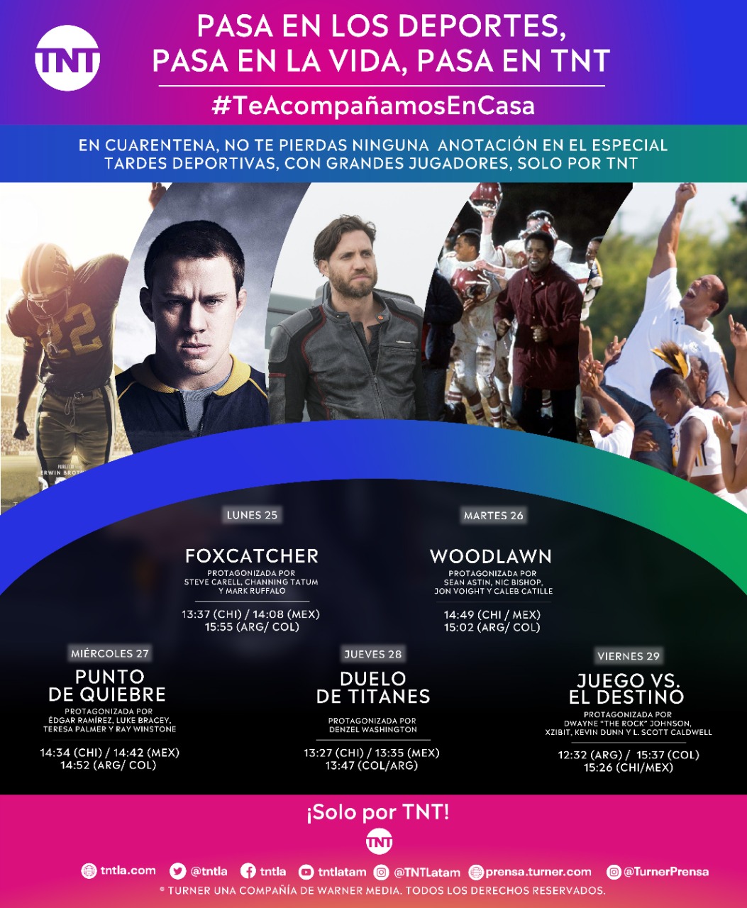 Durante este mes, TNT presenta el "Especial Tardes Deportivas", con una película diaria entre el lunes 25 y el viernes 29 en diferentes horarios. Grandes películas atractivas, con grandes actores como Steve Carrell, Mark Ruffalo, Jon Voight, Luc Bracey, Edgar Ramírez, Denzel Washington, Wood Harris y Dwayne Johnson.