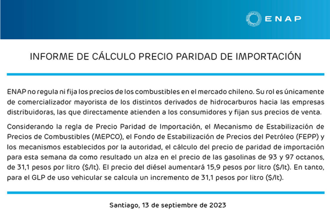 informe de ENAP, el alza entrará de las bencinas entrará en vigencia este