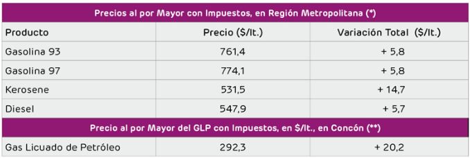 En cuanto a la gasolina de 93 y 97 octanos, su aumento será de 5,8 por litro, mientras que el diesel aumenta a $5,7.