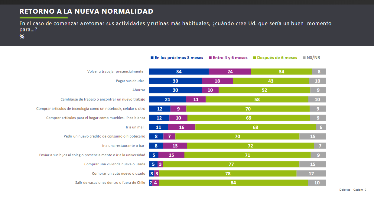 En cuanto a las expectativas de retorno a la nueva normalidad, mientras sólo el 34% cree que en los próximos tres meses sería un buen momento para volver a trabajar presencialmente, el 30% piensa que sería un buen periodo para pagar sus deudas.