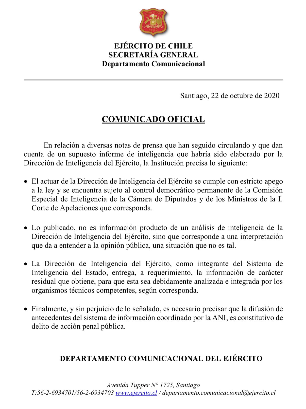 A través de un comunicado, la institución indicó que "lo publicado no es información producto de un análisis de inteligencia de la Dirección de Inteligencia del Ejército" y advirtió que "la difusión de antecedentes del sistema de información coordinado por la ANI, es constitutivo de delito de acción penal pública".