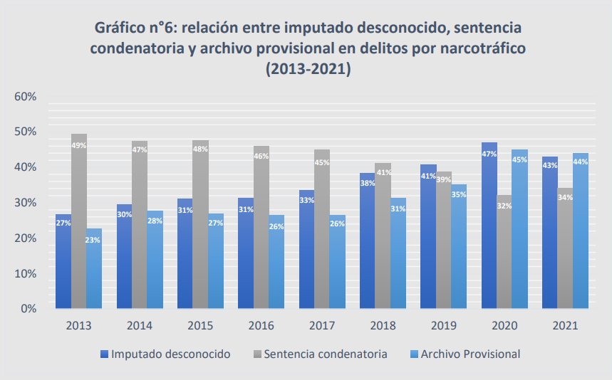 Paralelamente a la caída en condenas, se produce un aumento en el porcentaje de archivos provisionales, es decir, el Ministerio Público termina cada vez más las causas de narcotráfico, ya que no cuenta con antecedentes investigativos para proseguir en la persecución penal. "Es ilustrativo que durante el período 2013-2021 la cantidad de archivos aumentó en un 163%, es decir, si en 2013 se archivaron 5.308 causas, el 2021 fueron 13.966", sostiene el estudio.