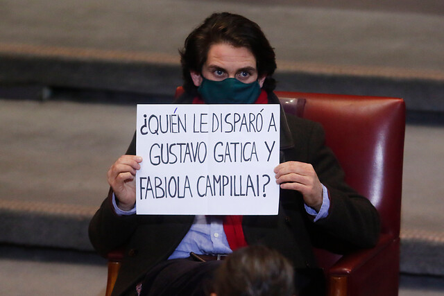 Mientras el presidente Sebastián Piñera llevaba a cabo su discurso, el parlamentario frenteamplista levantó un cartel con la pregunta: "¿Quién le disparó a Gustavo Gatica y Fabiola Campillai?".