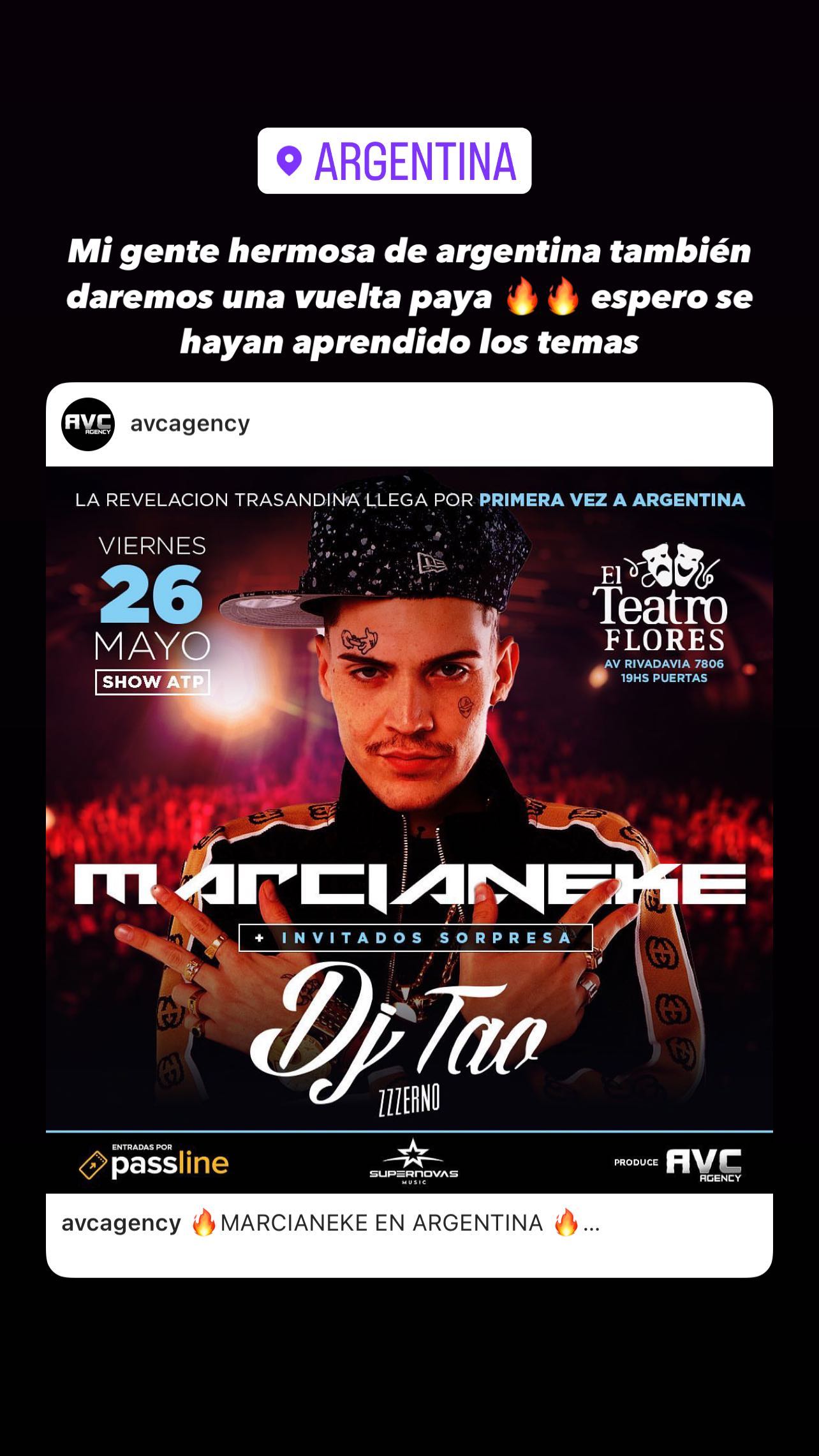 Tras el anuncio compartido por la productora de eventos, Marcianeke invitó a sus fans a asistir a su primer concierto en suelo argentino compartiendo una historia en su cuenta de Instagram.
