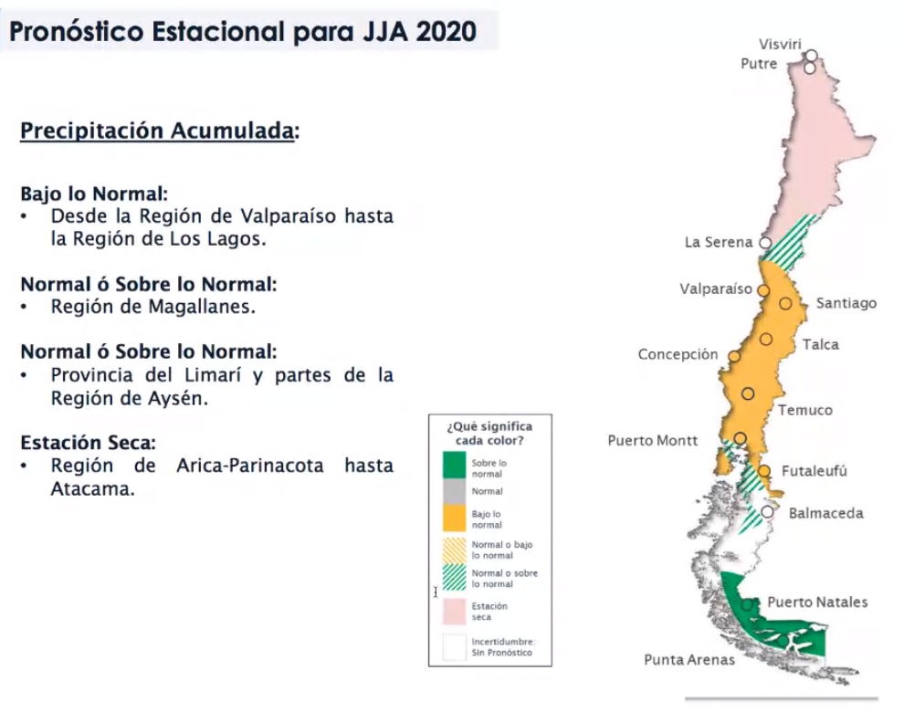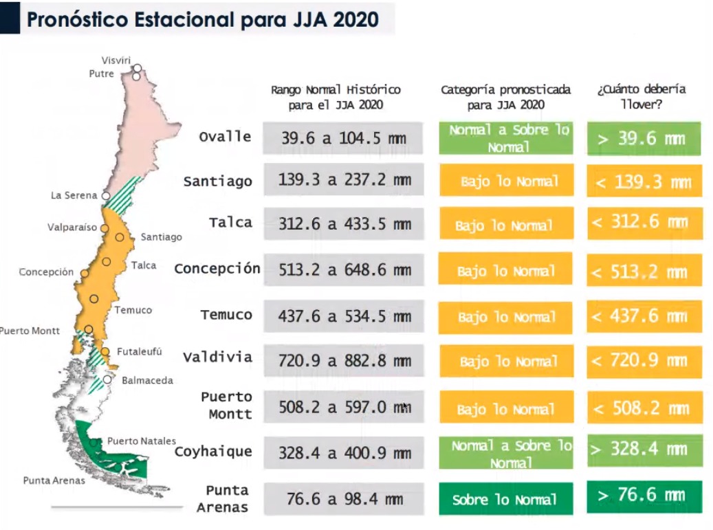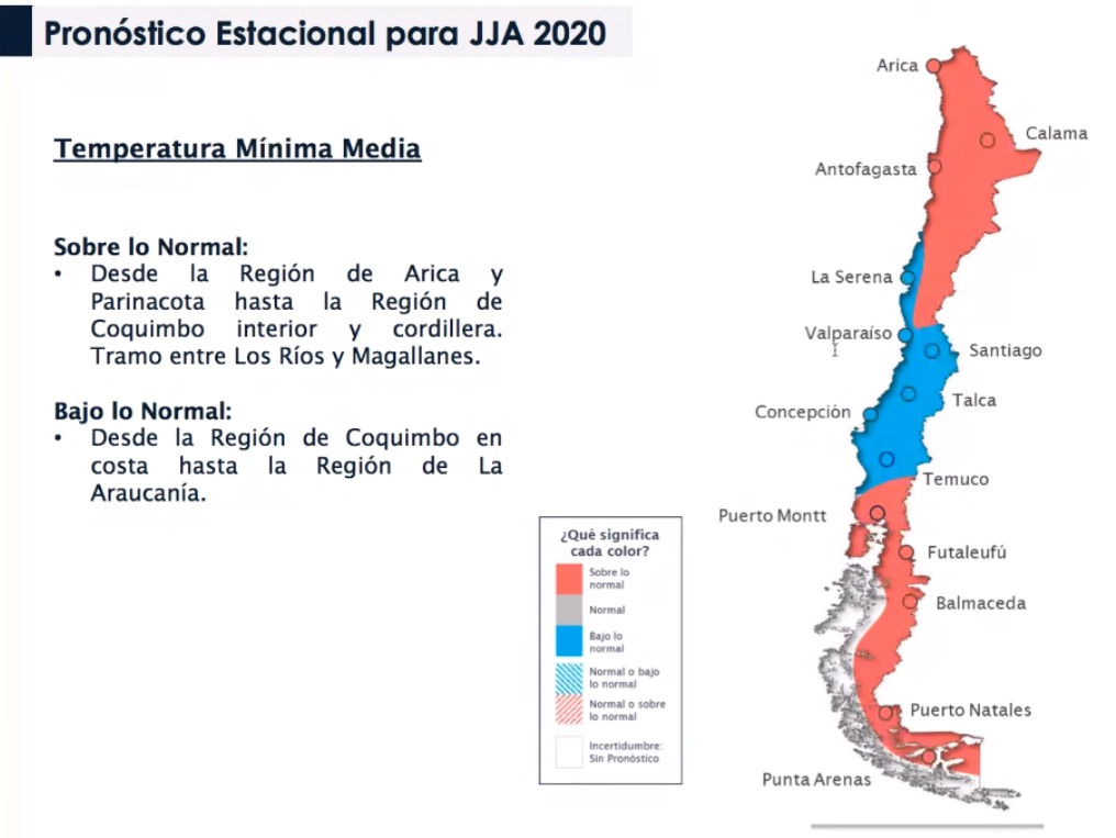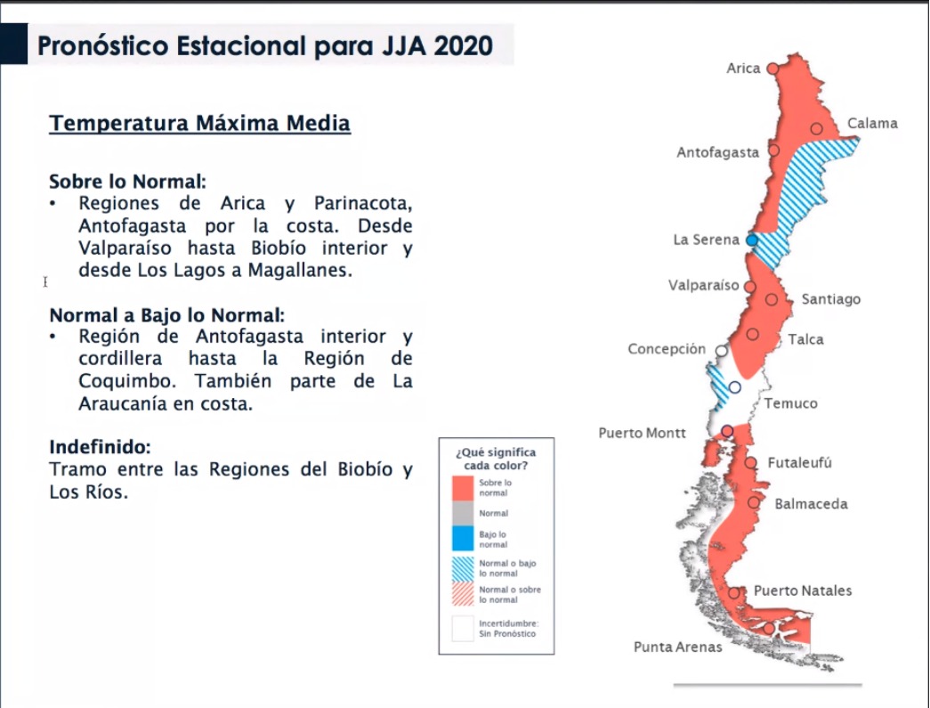 Además del déficit de lluvias, la Dirección Meteorológica de Chile proyecta un invierno 2020 con temperaturas máximas por sobre los rangos normales para la estación en “Arica-Parinacota, Tarapacá y la costa de Antofagasta. También entre Valparaíso y el interior de Biobío, y, por el interior, desde Los Lagos hasta Magallanes.